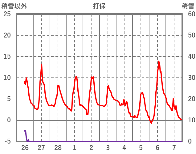 | 日 | 時 | 気温 | 降水 | 風向/風速 | 日照 | 積雪 | 降雪 |