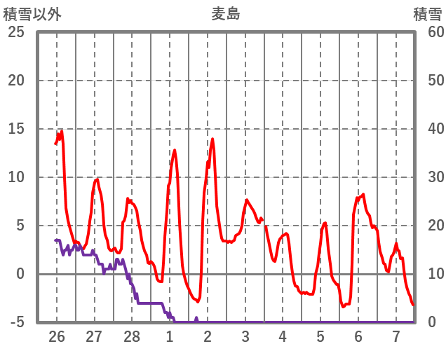 | 日 | 時 | 気温 | 降水 | 風向/風速 | 日照 | 積雪 | 降雪 |