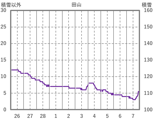 | 日 | 時 | 気温 | 降水 | 風向/風速 | 日照 | 積雪 | 降雪 |