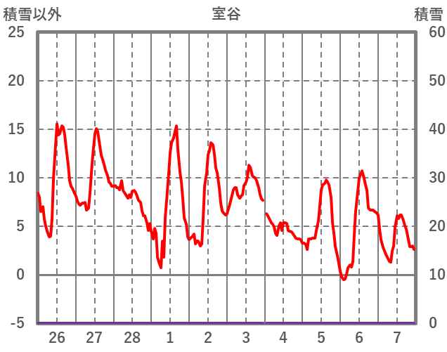 | 日 | 時 | 気温 | 降水 | 風向/風速 | 日照 | 積雪 | 降雪 |