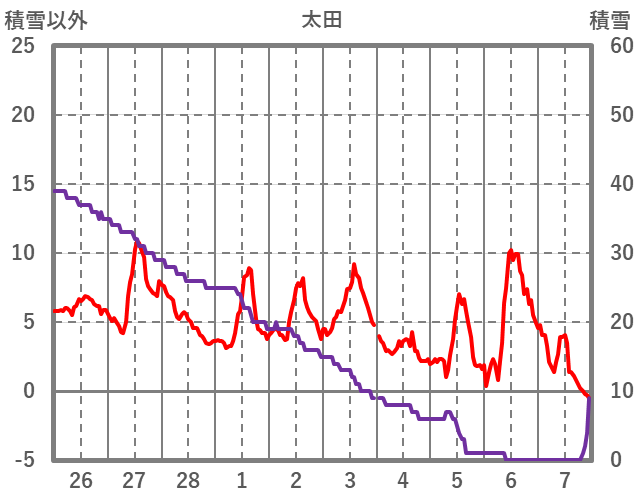 | 日 | 時 | 気温 | 降水 | 風向/風速 | 日照 | 積雪 | 降雪 |