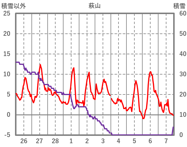 | 日 | 時 | 気温 | 降水 | 風向/風速 | 日照 | 積雪 | 降雪 |