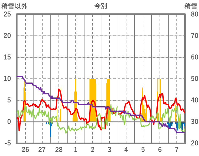 | 日 | 時 | 気温 | 降水 | 風向/風速 | 日照 | 積雪 | 降雪 |
