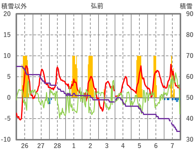 | 日 | 時 | 気温 | 降水 | 風向/風速 | 日照 | 積雪 | 降雪 |