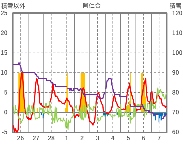 | 日 | 時 | 気温 | 降水 | 風向/風速 | 日照 | 積雪 | 降雪 |