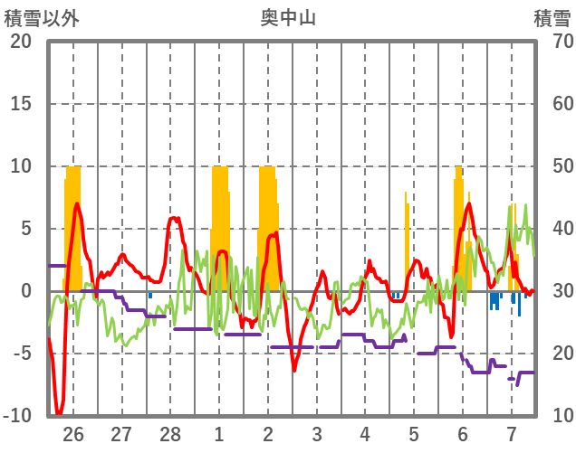 | 日 | 時 | 気温 | 降水 | 風向/風速 | 日照 | 積雪 | 降雪 |