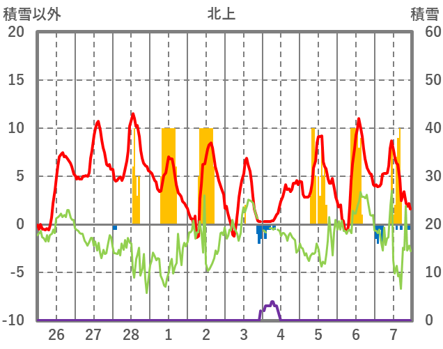 | 日 | 時 | 気温 | 降水 | 風向/風速 | 日照 | 積雪 | 降雪 |