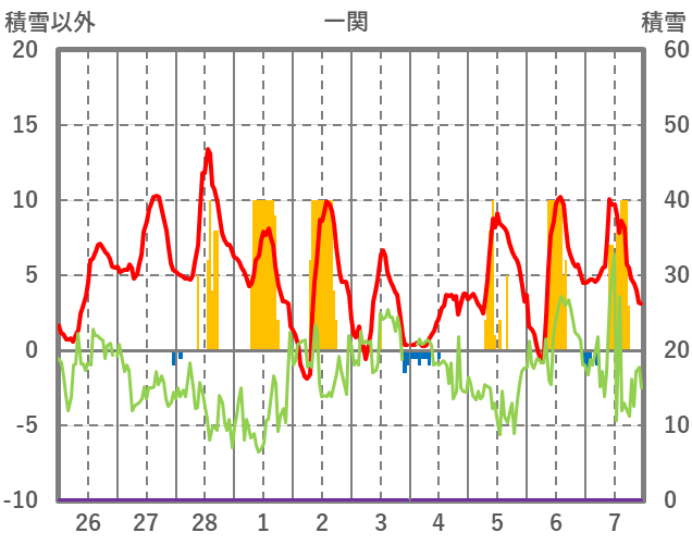 | 日 | 時 | 気温 | 降水 | 風向/風速 | 日照 | 積雪 | 降雪 |