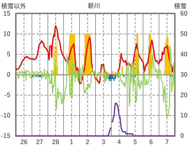 | 日 | 時 | 気温 | 降水 | 風向/風速 | 日照 | 積雪 | 降雪 |