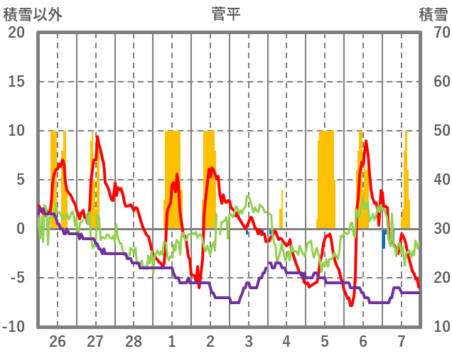 | 日 | 時 | 気温 | 降水 | 風向/風速 | 日照 | 積雪 | 降雪 |