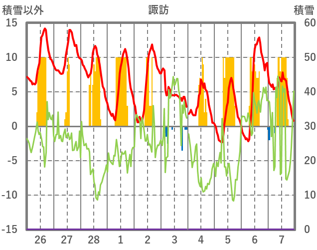 | 日 | 時 | 気温 | 降水 | 風向/風速 | 日照 | 積雪 | 降雪 |
