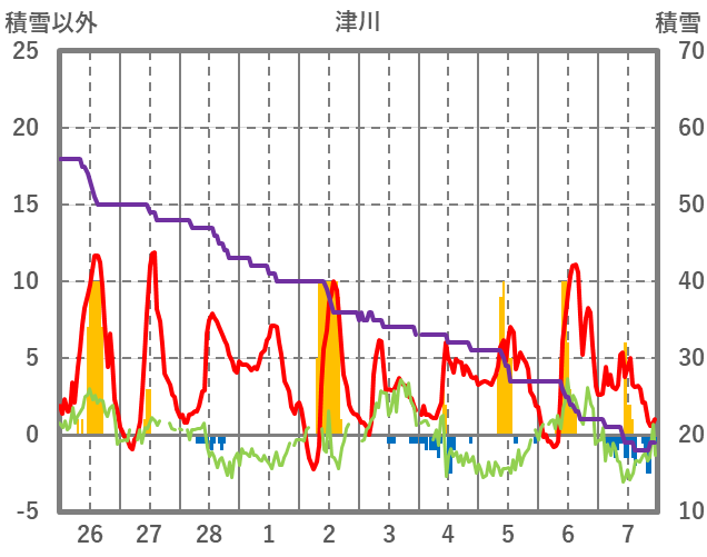 | 日 | 時 | 気温 | 降水 | 風向/風速 | 日照 | 積雪 | 降雪 |