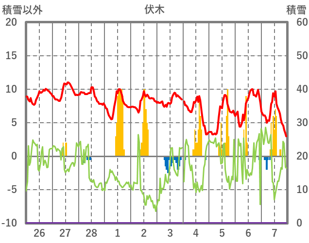 | 日 | 時 | 気温 | 降水 | 風向/風速 | 日照 | 積雪 | 降雪 |