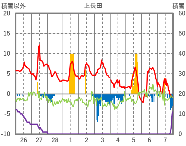| 日 | 時 | 気温 | 降水 | 風向/風速 | 日照 | 積雪 | 降雪 |