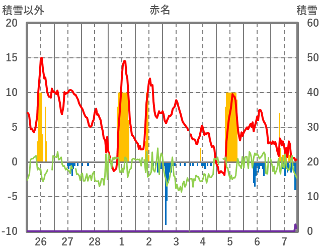 | 日 | 時 | 気温 | 降水 | 風向/風速 | 日照 | 積雪 | 降雪 |