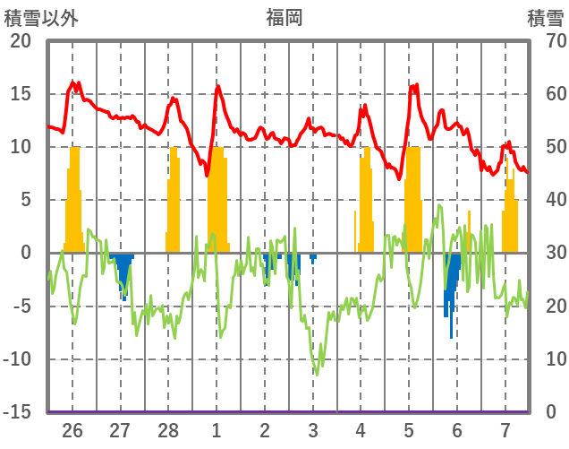 | 日 | 時 | 気温 | 降水 | 風向/風速 | 日照 | 積雪 | 降雪 |