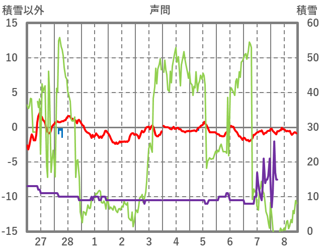 | 日 | 時 | 気温 | 降水 | 風向/風速 | 日照 | 積雪 | 降雪 |