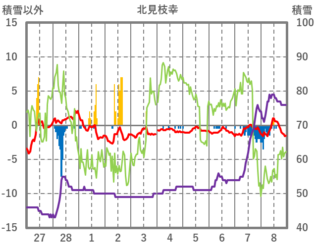 | 日 | 時 | 気温 | 降水 | 風向/風速 | 日照 | 積雪 | 降雪 |