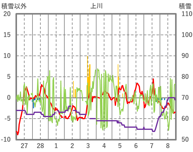 | 日 | 時 | 気温 | 降水 | 風向/風速 | 日照 | 積雪 | 降雪 |