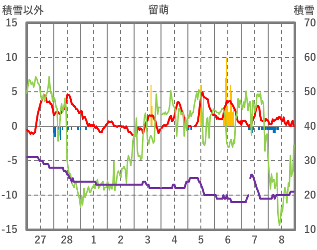 | 日 | 時 | 気温 | 降水 | 風向/風速 | 日照 | 積雪 | 降雪 |