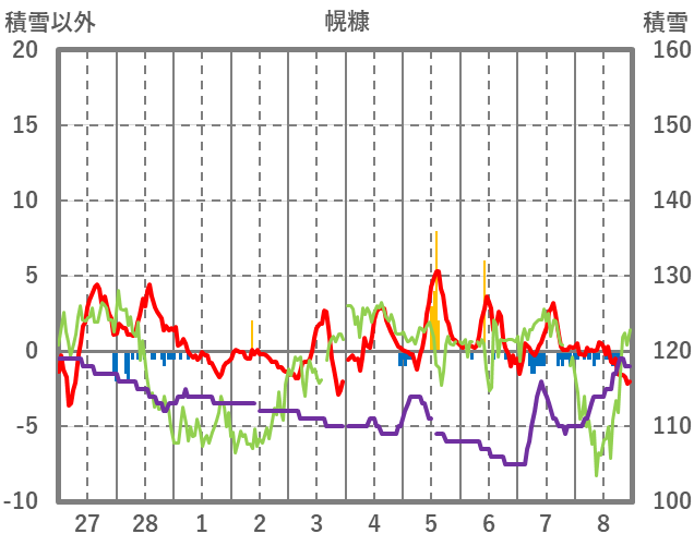| 日 | 時 | 気温 | 降水 | 風向/風速 | 日照 | 積雪 | 降雪 |