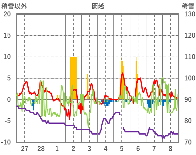 | 日 | 時 | 気温 | 降水 | 風向/風速 | 日照 | 積雪 | 降雪 |