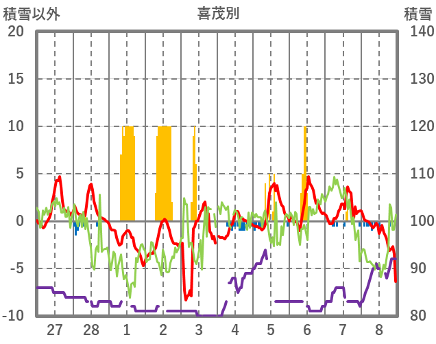 | 日 | 時 | 気温 | 降水 | 風向/風速 | 日照 | 積雪 | 降雪 |