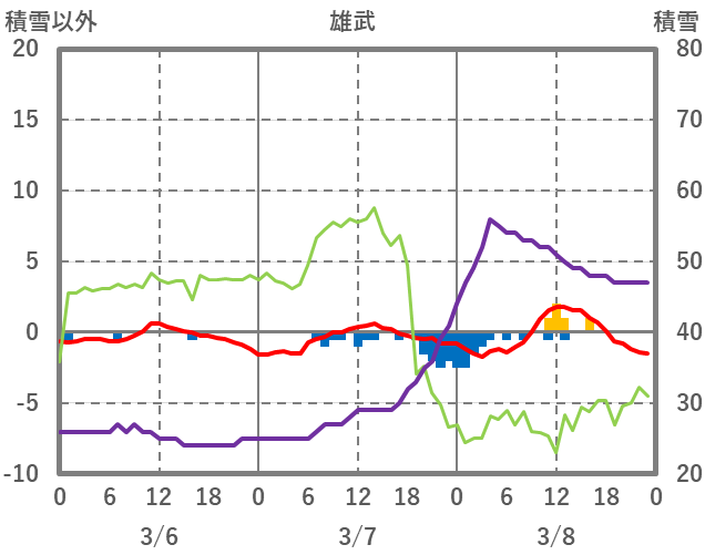 | 日 | 時 | 気温 | 降水 | 風向/風速 | 日照 | 積雪 | 降雪 |