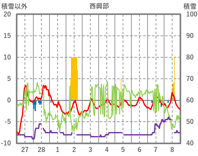 | 日 | 時 | 気温 | 降水 | 風向/風速 | 日照 | 積雪 | 降雪 |