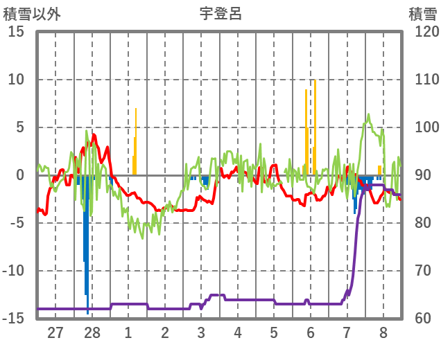 | 日 | 時 | 気温 | 降水 | 風向/風速 | 日照 | 積雪 | 降雪 |