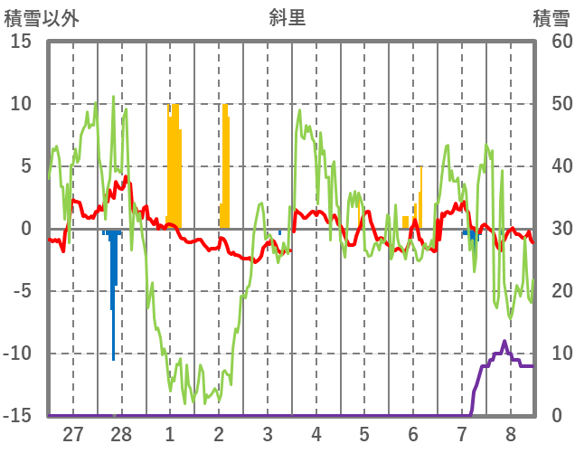 | 日 | 時 | 気温 | 降水 | 風向/風速 | 日照 | 積雪 | 降雪 |