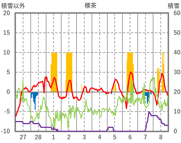 | 日 | 時 | 気温 | 降水 | 風向/風速 | 日照 | 積雪 | 降雪 |