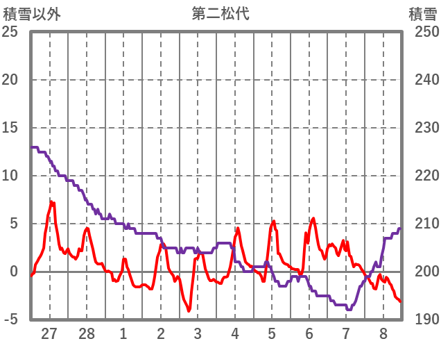 | 日 | 時 | 気温 | 降水 | 風向/風速 | 日照 | 積雪 | 降雪 |