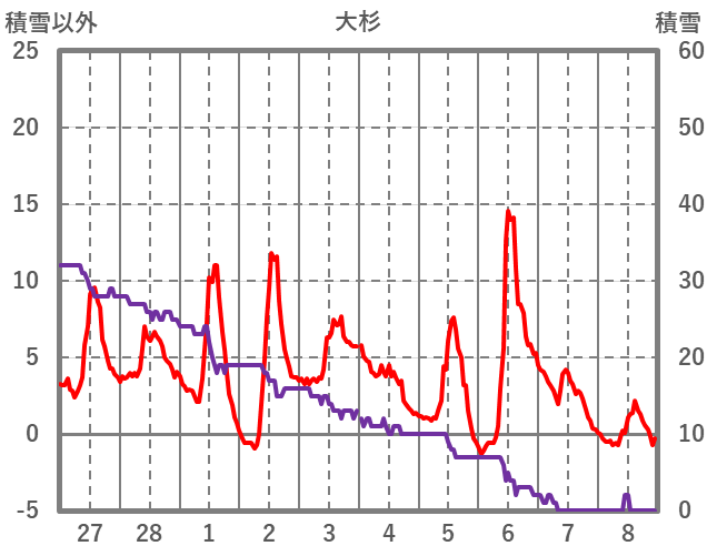 | 日 | 時 | 気温 | 降水 | 風向/風速 | 日照 | 積雪 | 降雪 |
