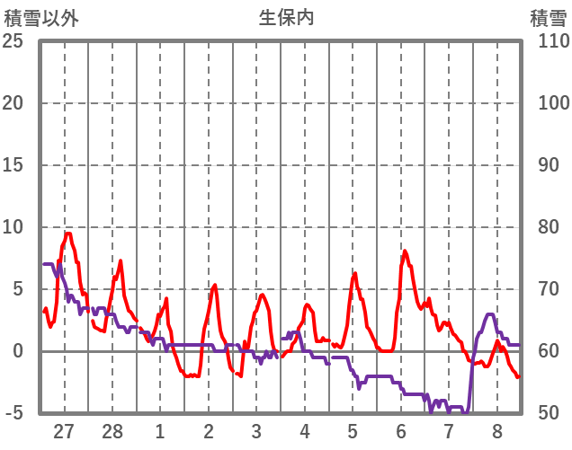 | 日 | 時 | 気温 | 降水 | 風向/風速 | 日照 | 積雪 | 降雪 |