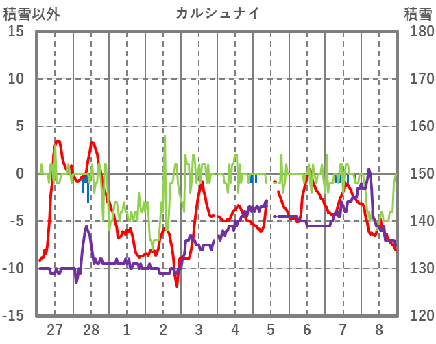 | 日 | 時 | 気温 | 降水 | 風向/風速 | 日照 | 積雪 | 降雪 |