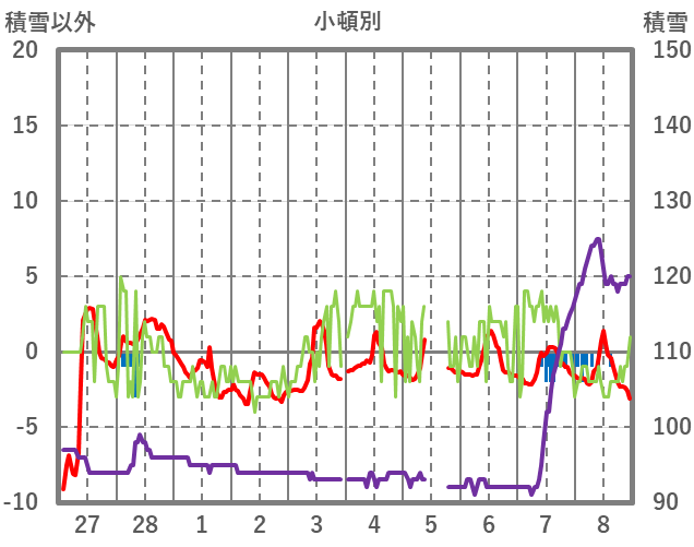 | 日 | 時 | 気温 | 降水 | 風向/風速 | 日照 | 積雪 | 降雪 |