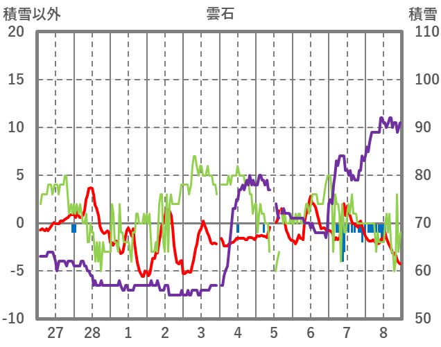 | 日 | 時 | 気温 | 降水 | 風向/風速 | 日照 | 積雪 | 降雪 |