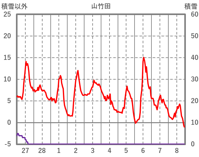 | 日 | 時 | 気温 | 降水 | 風向/風速 | 日照 | 積雪 | 降雪 |