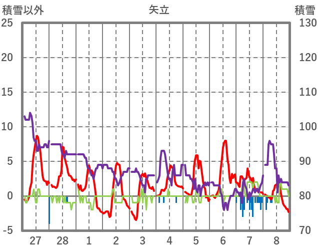 | 日 | 時 | 気温 | 降水 | 風向/風速 | 日照 | 積雪 | 降雪 |