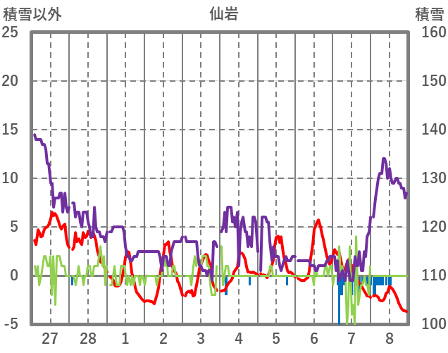 | 日 | 時 | 気温 | 降水 | 風向/風速 | 日照 | 積雪 | 降雪 |