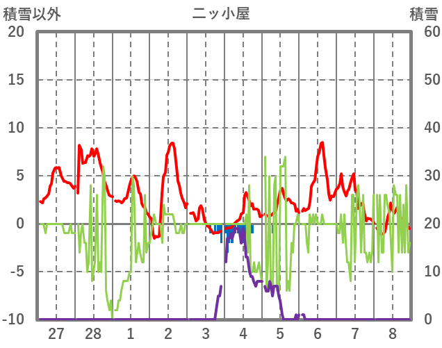 | 日 | 時 | 気温 | 降水 | 風向/風速 | 日照 | 積雪 | 降雪 |
