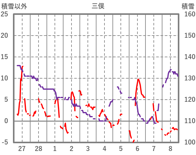 | 日 | 時 | 気温 | 降水 | 風向/風速 | 日照 | 積雪 | 降雪 |