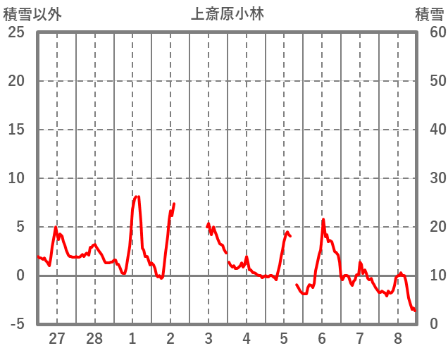 | 日 | 時 | 気温 | 降水 | 風向/風速 | 日照 | 積雪 | 降雪 |