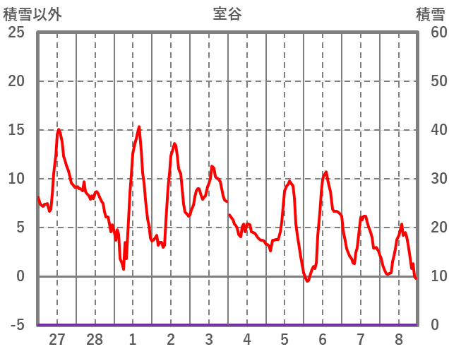 | 日 | 時 | 気温 | 降水 | 風向/風速 | 日照 | 積雪 | 降雪 |