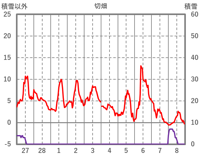 | 日 | 時 | 気温 | 降水 | 風向/風速 | 日照 | 積雪 | 降雪 |