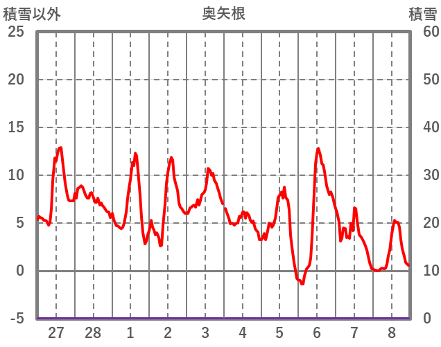 | 日 | 時 | 気温 | 降水 | 風向/風速 | 日照 | 積雪 | 降雪 |