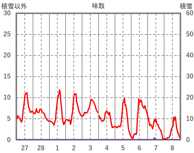 | 日 | 時 | 気温 | 降水 | 風向/風速 | 日照 | 積雪 | 降雪 |