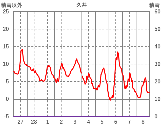 | 日 | 時 | 気温 | 降水 | 風向/風速 | 日照 | 積雪 | 降雪 |