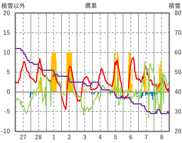 | 日 | 時 | 気温 | 降水 | 風向/風速 | 日照 | 積雪 | 降雪 |